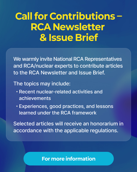 Call for Contributions- RCA Newsletters and Issue BriefsDear National RCA Representatives, Since the publication of the first issue of the RCA Newsletter in March 2022, the Newsletters and Issue Briefs have continuously evolved thanks to the generous contributions and active participation of RCA Government Parties and experts across the region. Over the past years, these publications have become a vital platform to share knowledge, highlight research achievements, and promote regional cooperation in the peaceful use of nuclear science and technology. The contributions from each country have played a central role in documenting the progress and diversity of RCA activities. We are now preparing the new issues for them and we would be delighted to feature articles from your country showcasing recent nuclear-related activities, achievements, or perspectives in nuclear science and technology. We warmly welcome contributions either written directly by the National RCA Representative or by national experts, institutions, or project teams involved in RCA-related work. Articles that highlight your country’s experience, good practices, or lessons learned in the RCA framework will be highly appreciated. Each selected article will receive an honorarium* as a token of appreciation. For details regarding topics, article structure, and submission process, please refer to Annex 1 & 2 (Guidelines for Contributors). *For Newsletters, USD400 per article / for Issue Briefs, USD1,200 per issue. Your continued participation will greatly contribute to further enhancing the visibility and impact of RCA cooperation. We sincerely hope for your active engagement and look forward to your valuable contributions. Sincerely yours, Dae Ki Kim Director RCA Regional Office